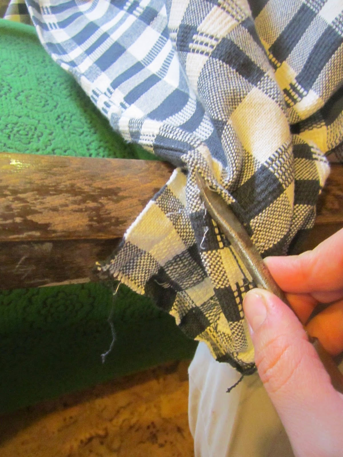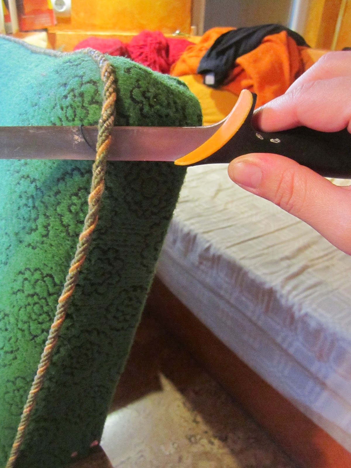 Pontosan kettévágtam a takarót. A háttámlával kezdtem, ameddig csak lehetett benyomkodtam az ülés és a támla közé a szövetet majd a széleken kibontottam a “tripla” beszegést.