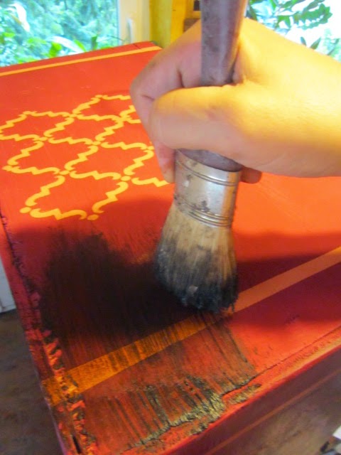 enyhén megcsiszoltam, visszakoptattam, hogy az alsó világos Paloma szín előbújjon majd Clear waxal fixáltam végül pedig az egészre Dark Wax került