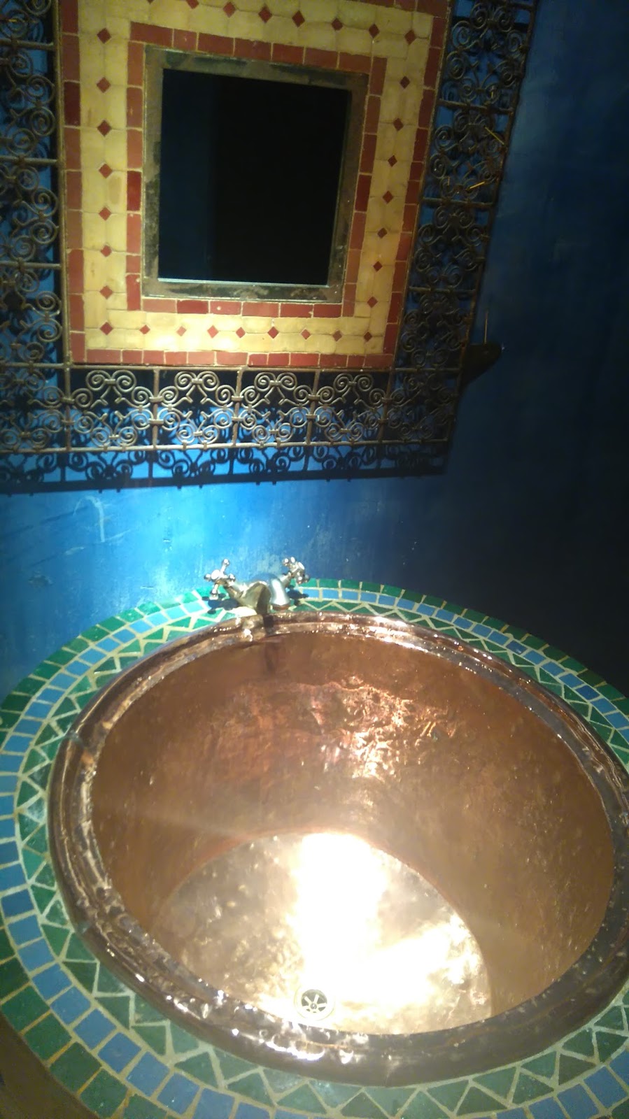 Egyszerűen mesés volt, egy óriási réz mosdókagyló azaz inkább kád! Közvetlenül fölötte egy lámpával, ami olyan hatást keltett a sötétkék helyiségben, mintha a nap beleesett volna és onnan ragyogna.