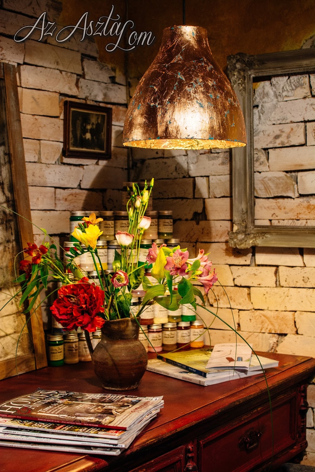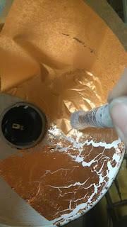 A műhelyemben egy 1500Ft-os Ikea Melodi lámpa is van, először virágosra festettem, egy év után meguntam és jöhetett a réz 🙂