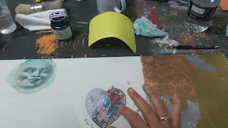 Kb 7-8 perc után a rézfólia, én púderes kézzel, finoman összegyűrtem, hogy kopott hatása legyen, úgy raktam fel és egy száraz ecsettel óvatosan beleütögettem.